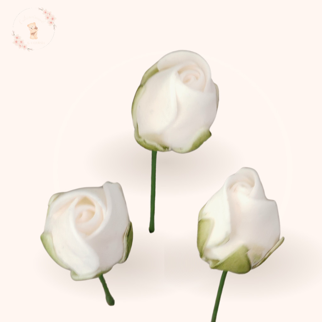Letisztult, elegáns fehér cukor bimbó, amely finom kiegészítője esküvői tortadíszeknek. Kézzel készült, nem ehető, tartós dekoráció, amely tökéletesen harmonizál cukor rózsákkal és levelekkel.