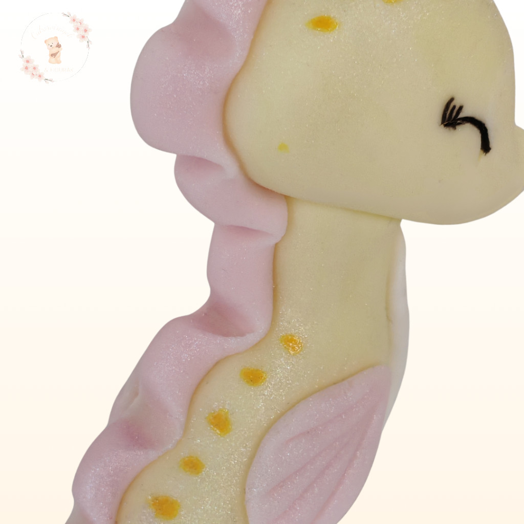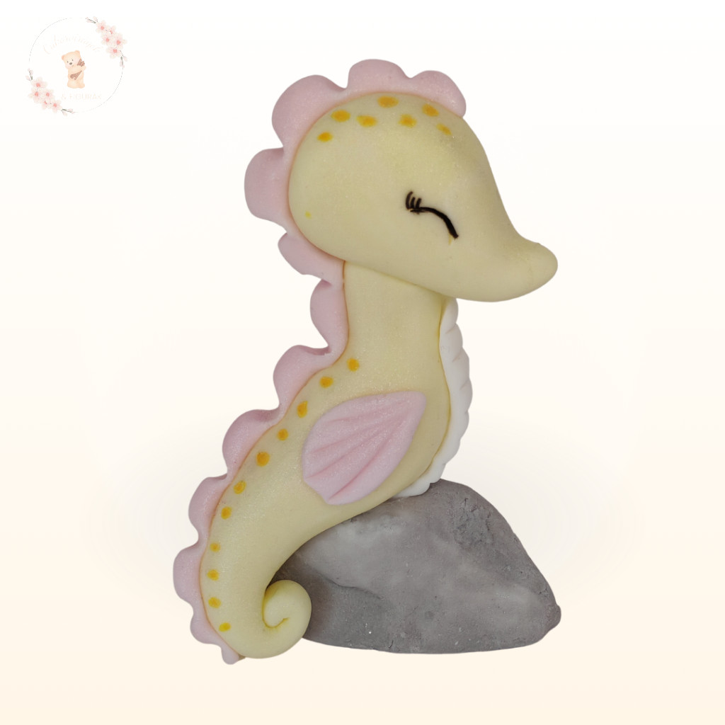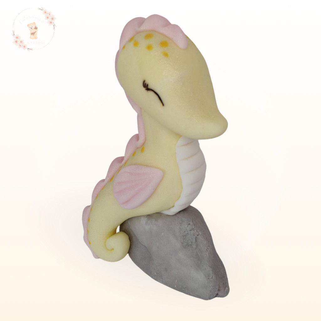 Kézzel készült tengeri csikó tortadísz pasztell sárga színben. Kedves és különleges választás tengeri témájú tortákhoz, önmagában vagy más figurákkal kombinálva.